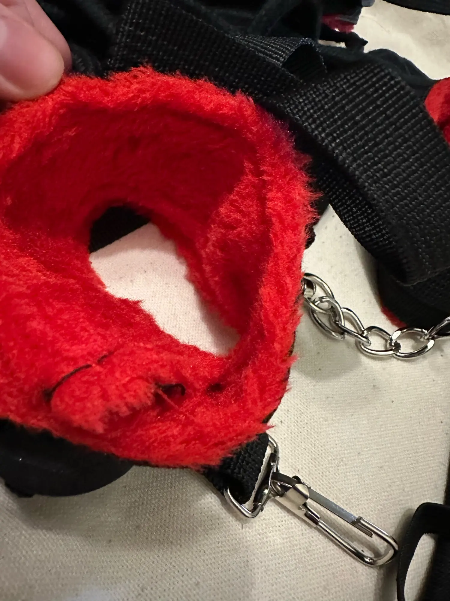 Menottes poignets et chevilles (intérieur rouge) : fermes, confortables et visuellement excitantes.